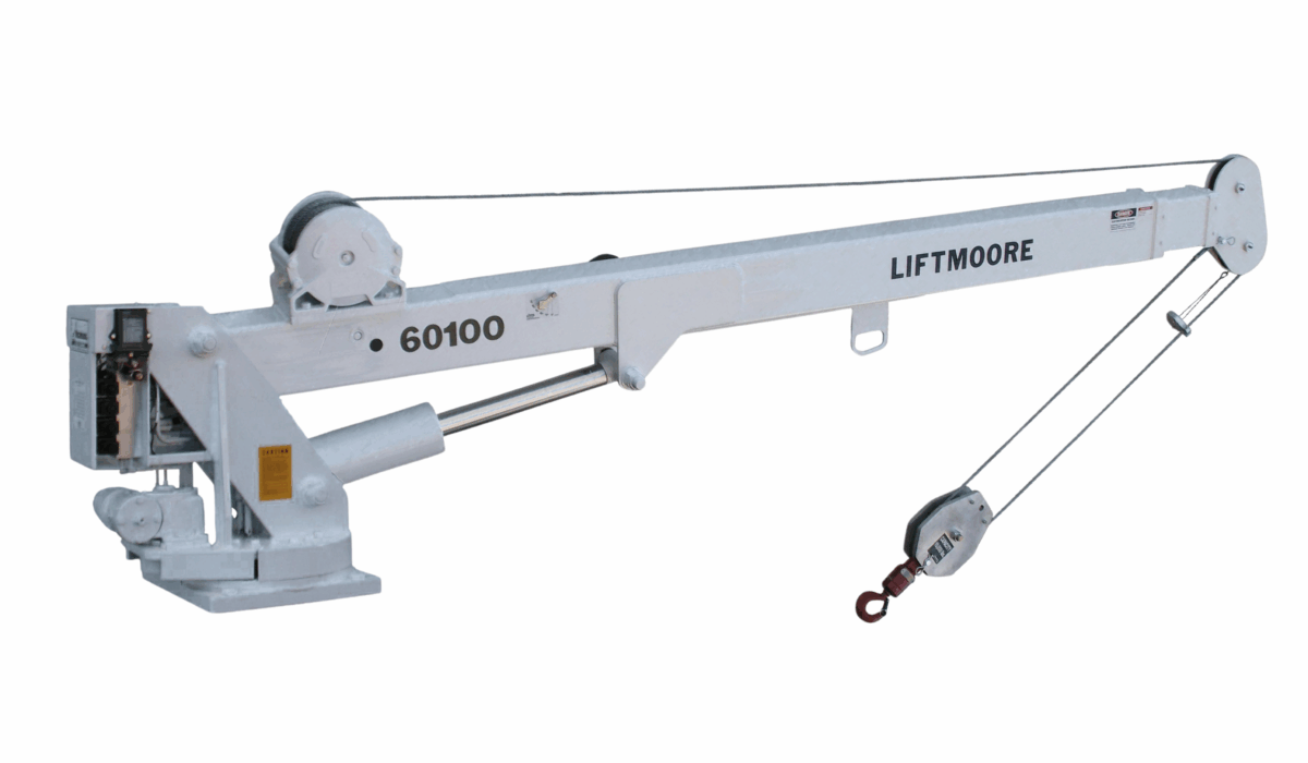 Hydraulic service crane with 6,000 lb lift capacity, up to 40,000 ft-lb moment rating, and variable boom extension (22′ or 30′). Power boom extension, full continuous 360° rotation, and planetary winch with two-block protection.
