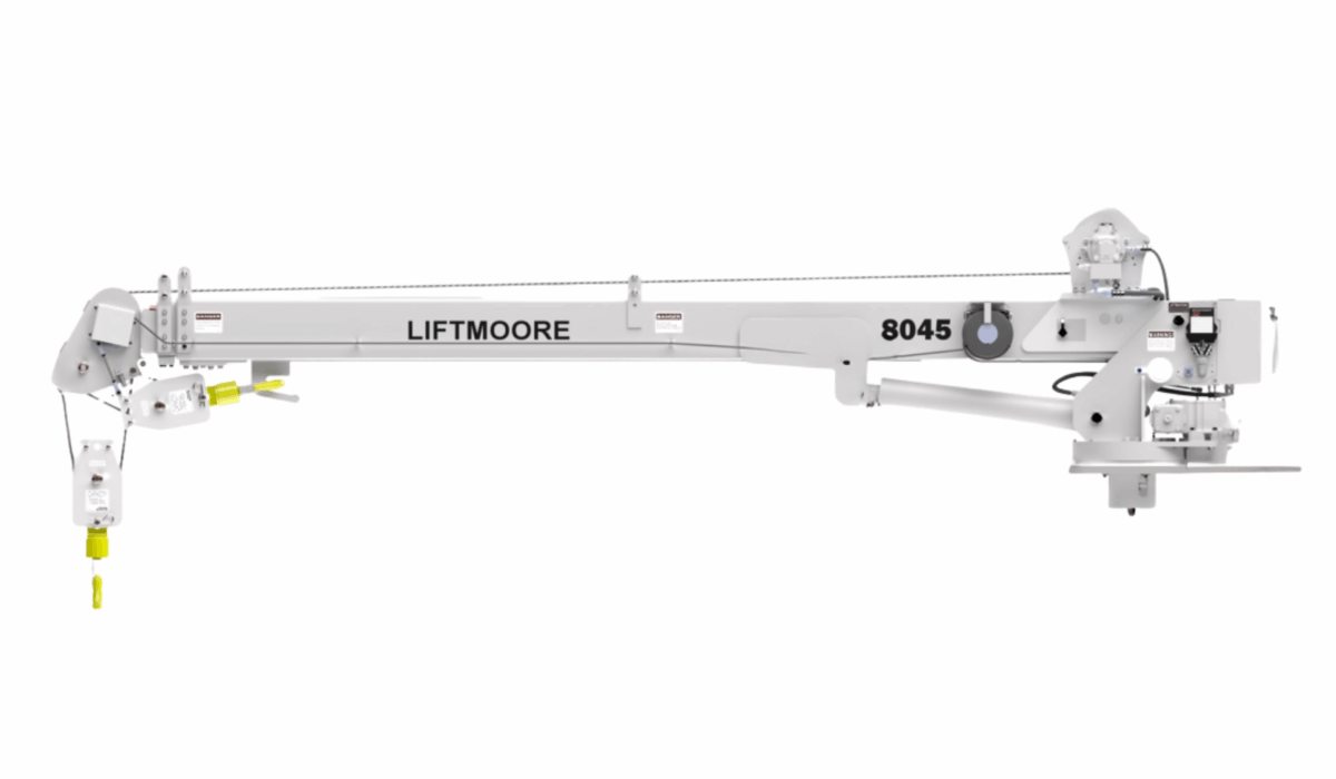 Hydraulic service crane with 8,000 lb lift capacity, 45,000 ft-lb moment rating, and power boom extension to 22 or 30 ft. Features continuous hydraulic rotation and a planetary winch with two-block protection.