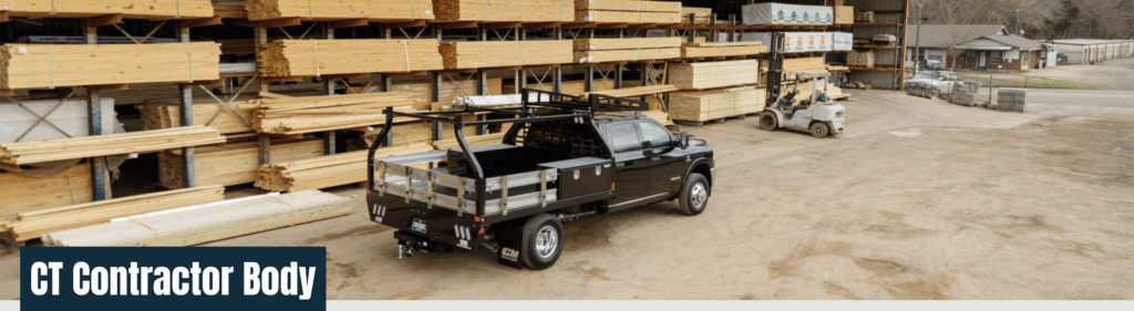 CM Truck Beds CT Contractor Body is built for crews who need open deck space, secure tool storage, and a heavy-duty material rack. It features a steel tread-plate deck, 18″ fold-down aluminum side rails, top-mounted toolboxes, and a 3,000 lb-rated overhead rack for hauling lumber and long materials. Available in 9′ 4″ and 11′ 4″ lengths with structural channel frame rails, LED lighting, and a 24,000 lb bumper-pull hitch.