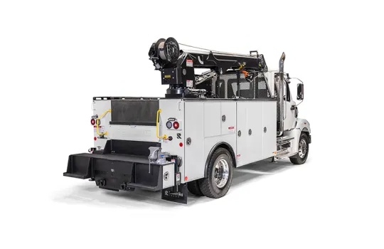 A mechanics crane truck is a mobile service vehicle built for field repair and equipment maintenance. It includes a mechanics body with organized tool storage, work surfaces, and compartments, along with a hydraulic crane for lifting parts and equipment in the field. Mechanics crane trucks are commonly used for construction, utilities, fleet maintenance, industrial service, and roadside repair.